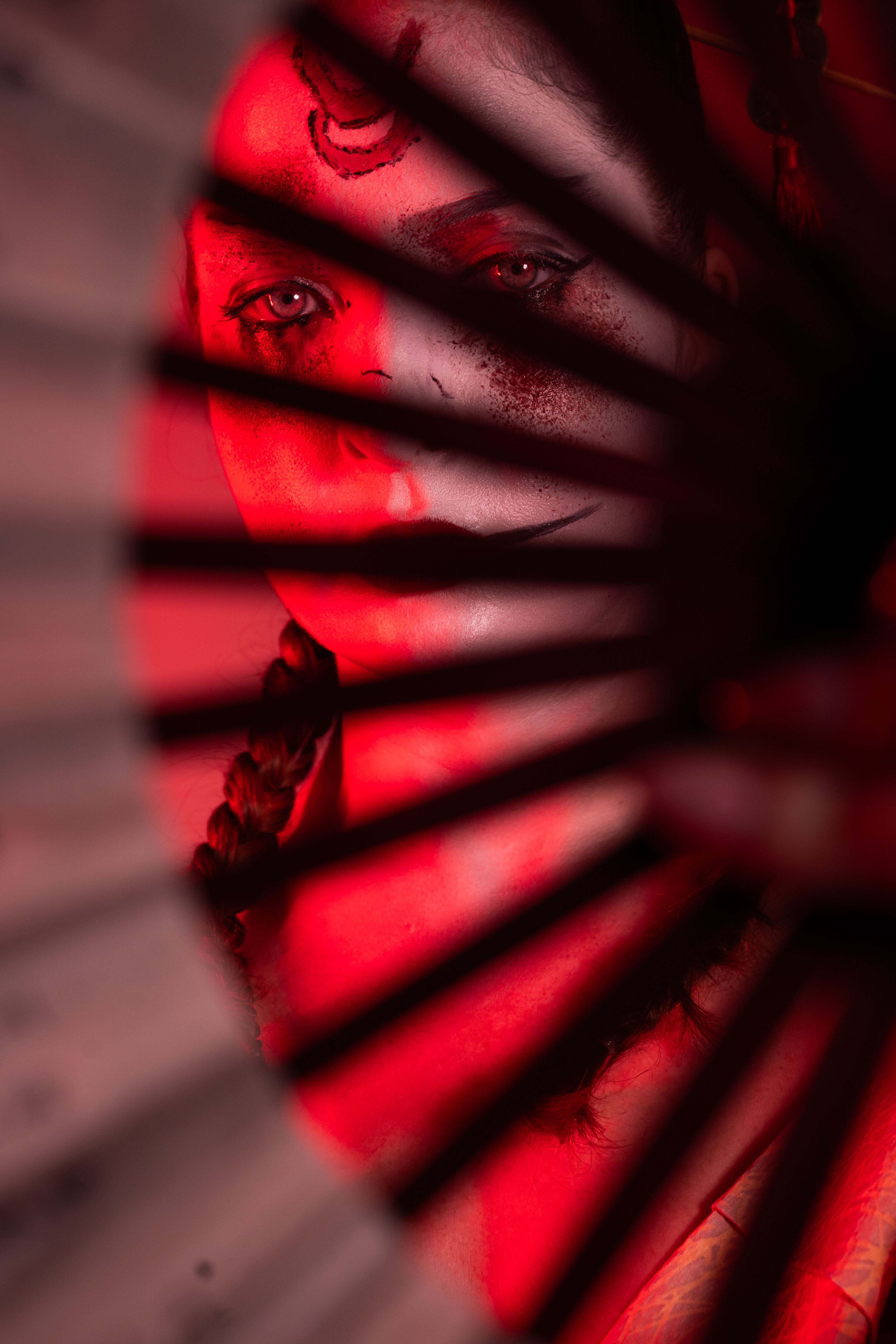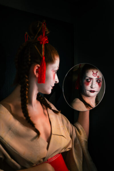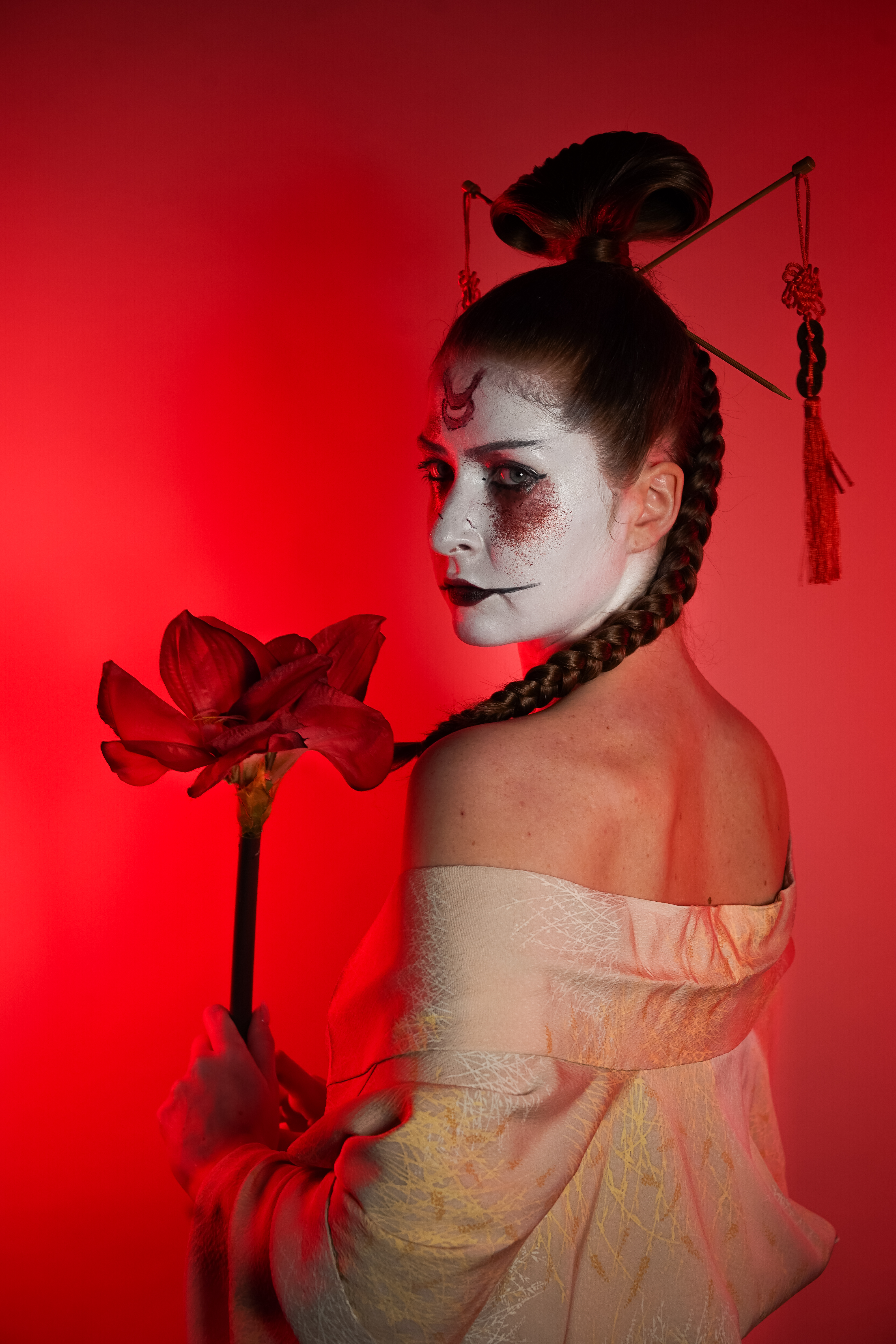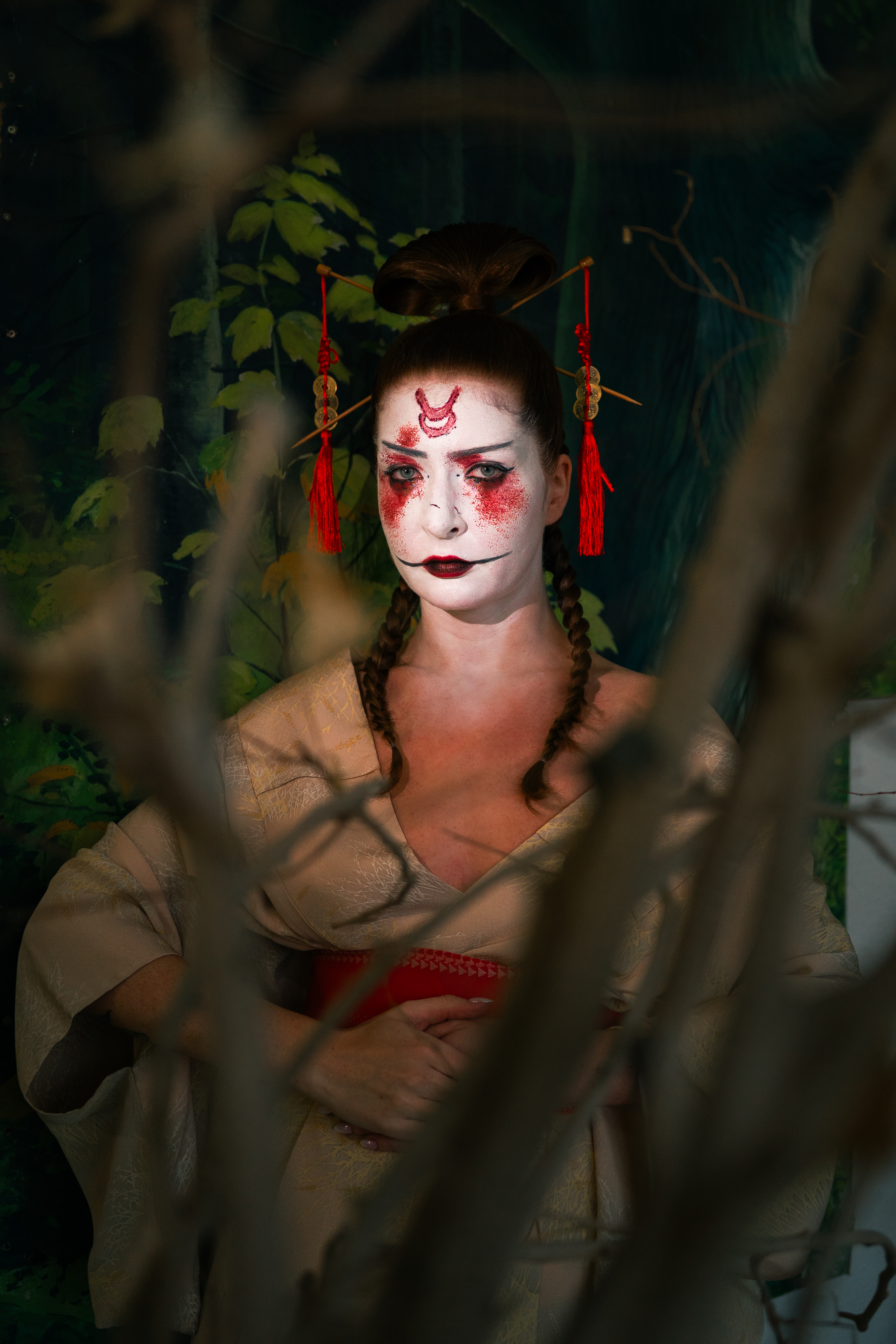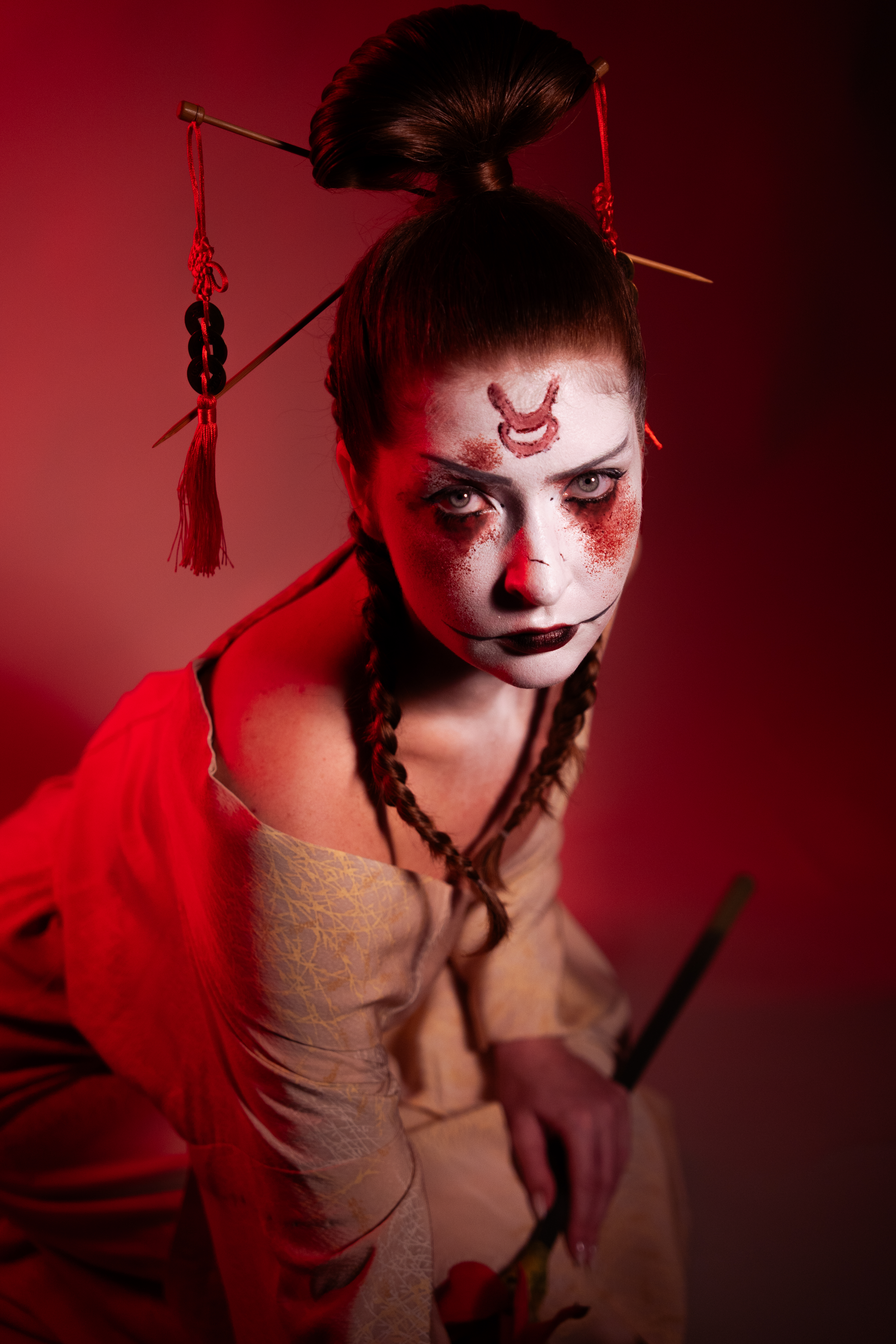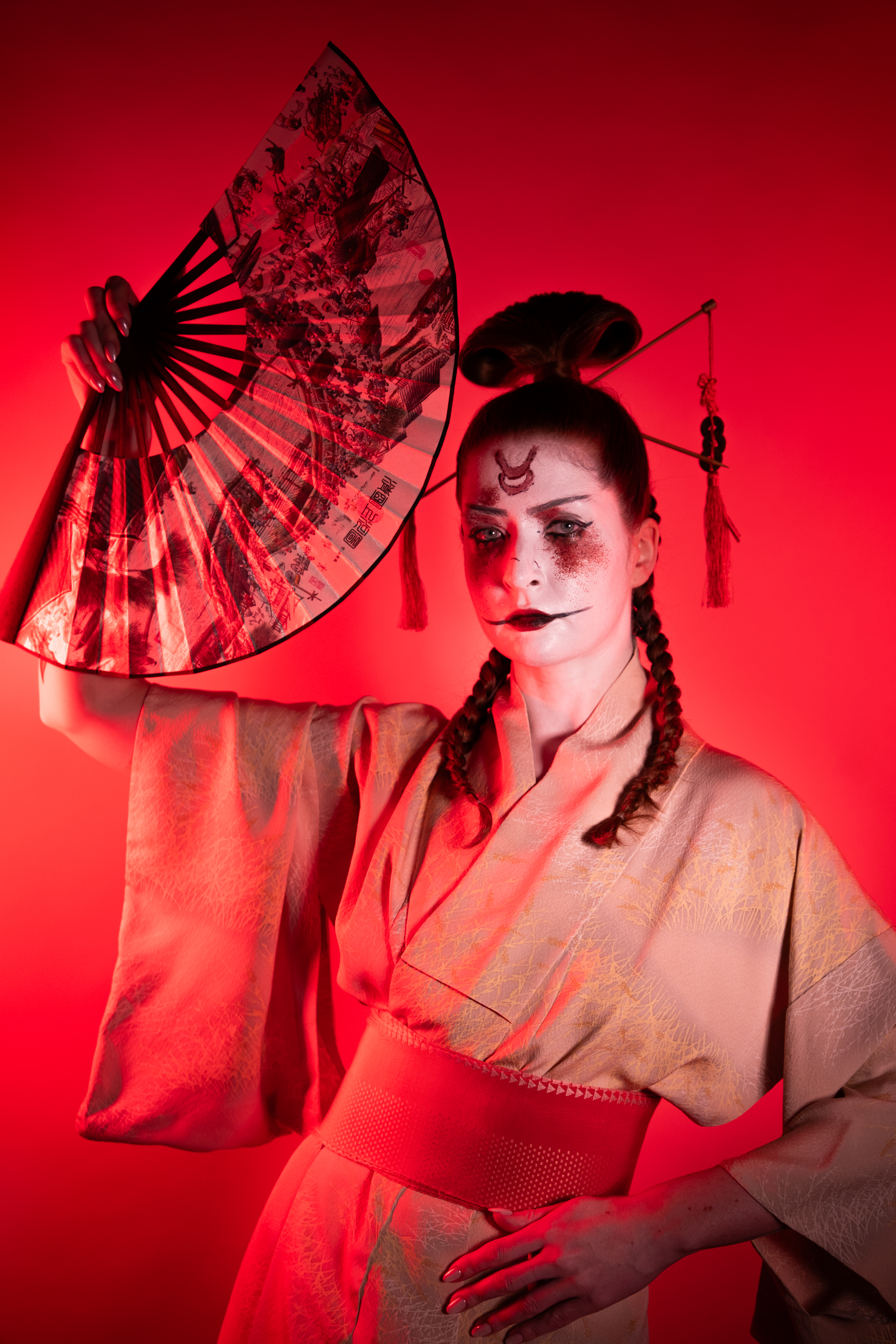 See fotolavastus viib vaataja maailma, kus Halloween ei ole ainult kostüüm, vaid roll. Jaapani mõjutustega meik, soeng ja poosid loovad karakteri, kes on samaaegselt rahulik, tugev ja salapärane. Valgus ja detailid annavad loole elu.